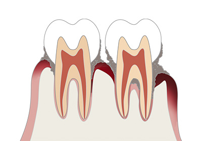 소실된 잇몸뼈 위로 세균 덩어리인 치석이 자라나고 그로 인해 치아 뿌리가 노출되면