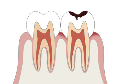 충치로 인해 치아 표면의 법랑질층이 파괴되고 내부의 상아질이 노출되면